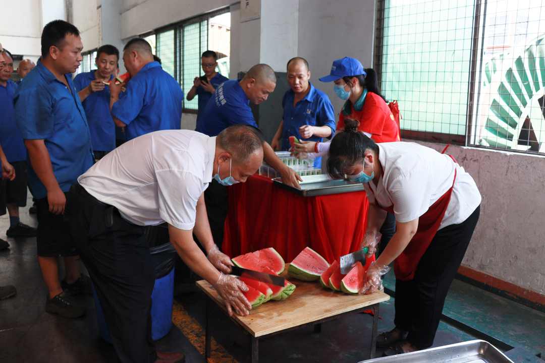 公司党团志愿服务队志愿者为一线工人送上西瓜