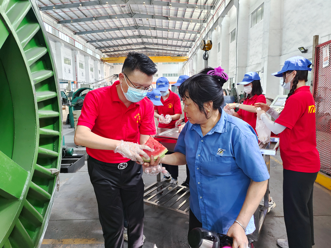 当日下午2点半左右,烈日炙烤着大地,酷暑难耐。公司党支部书记张亮、总经办吴总、人资部李总等领导带领公司党团志愿服务队志愿者们兵分多路,前往A、B、C、D、E厂区车间、机电部及仓储部、物流部高温作业区等,为一线工人送上西瓜、冰镇饮料等消暑物资。“师傅,您辛苦了,来吃西瓜。”每到一处,张书记、吴总、李总等都亲切问候一线工人,向大家高温期间坚守工作岗位表示深深的感谢和崇高的敬意,并叮嘱大家要注意防暑,多注意身体,合理安排工作和休息时间。