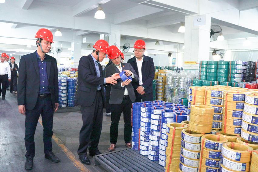 随后,调研指导组张威等领导一行在杨彦等的陪同下,先后前往888集团电缆自动化电线生产车间、电线电缆成品仓、技术研发中心等开展调研。